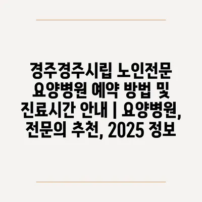 ✅ 경주경주시립 노인전문 요양병원의 진료시간과 예약 방법을 자세히 알아보세요.
