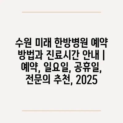 수원 미래 한방병원 예약 방법과 진료시간 공지 | 예약, 일요일, 공휴일, 전연락 추천, 2025 에 대해 자주 묻는 질문 TOP 5